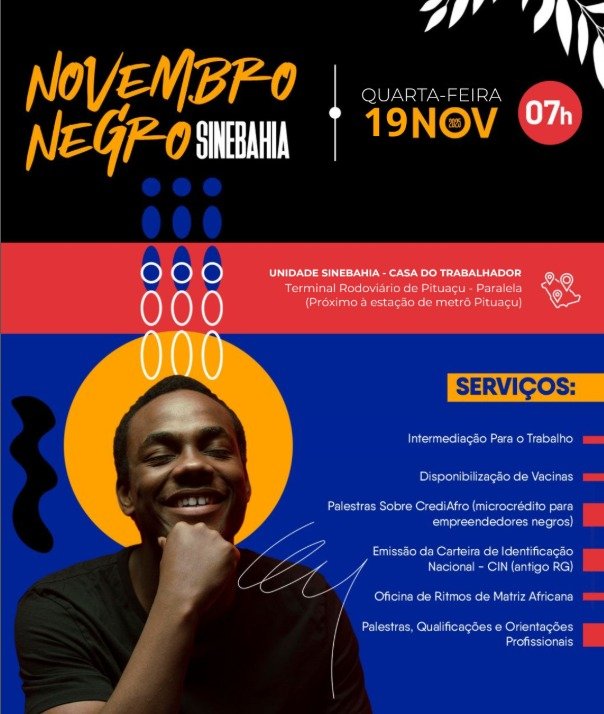 O SineBahia promove, nesta quarta-feira (19/11), a partir das 7h, uma ação especial em comemoração ao Novembro Negro na unidade Casa do Trabalhador, instalada no Terminal de Pituaçu, em Salvador. A iniciativa reforça o compromisso do serviço público com o fortalecimento da população negra por meio de inclusão, oportunidades e acesso a direitos.
